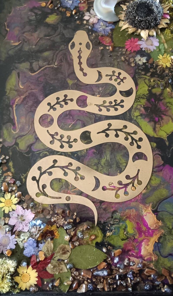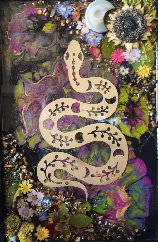 acrylics, dried flowers, resin and metal